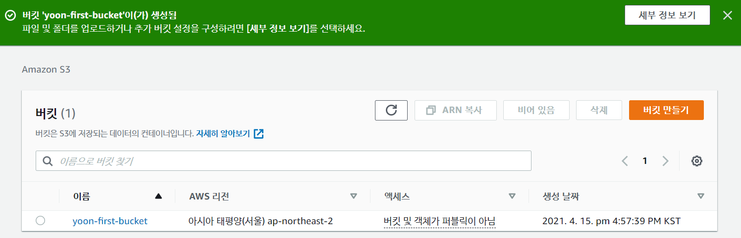4. 버킷을 생성합니다. 콘솔에서 버킷이 생성되었음을 확인합니다.