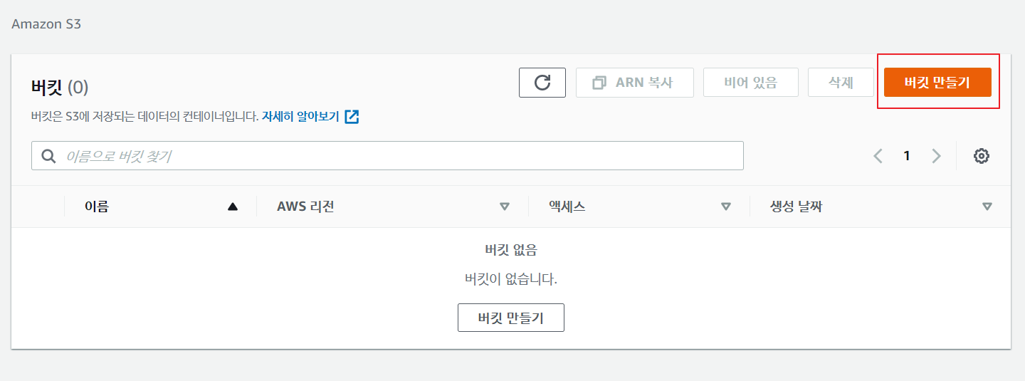 1. Amazon S3 콘솔을 열고(https://console.aws.amazon.com/s3/) 버킷 만들기를 선택합니다.