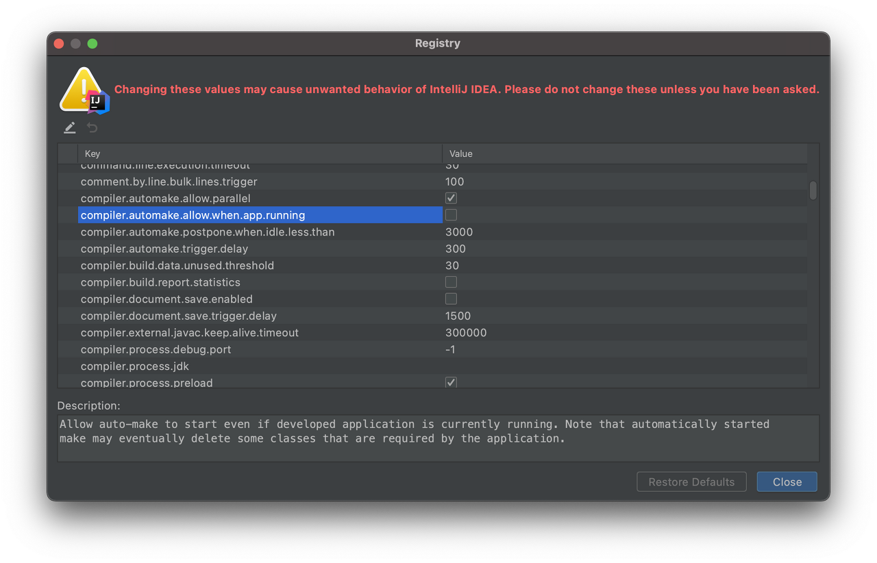 3. Find Action(Command+Shift+A) > Registry > compiler.automake.allow.when.app.running 체크